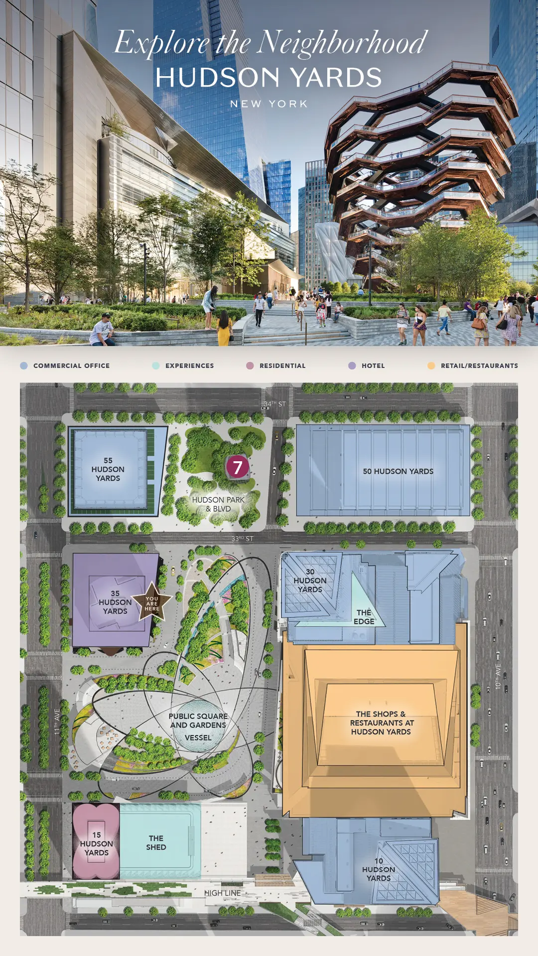 Penn Station is located on 33rd Street and 8th Avenue, a 7-minute from the hotel. If you are coming from Penn Station, walk west down 31st Street where you will enter Hudson Yards.
