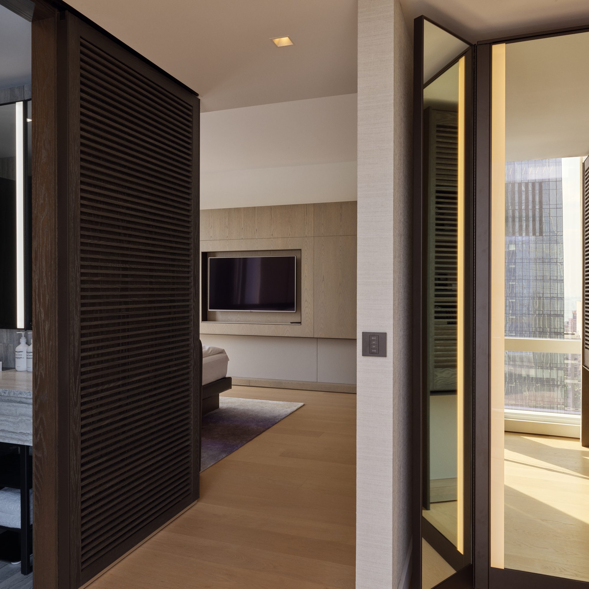 Reawaken or wind down in your spa-grade bathroom, featuring a unique surround shower design that offers three adjustable heads for an immersive, customizable experience. Indulge in our custom Grown Alchemist holistic bath products, made with herbs grown on the High Line park below your room with separate formulas for AM & PM use. Stone-topped vanities, a large closet, and mirrored dressing area provide the space you need to care for yourself, morning and night.