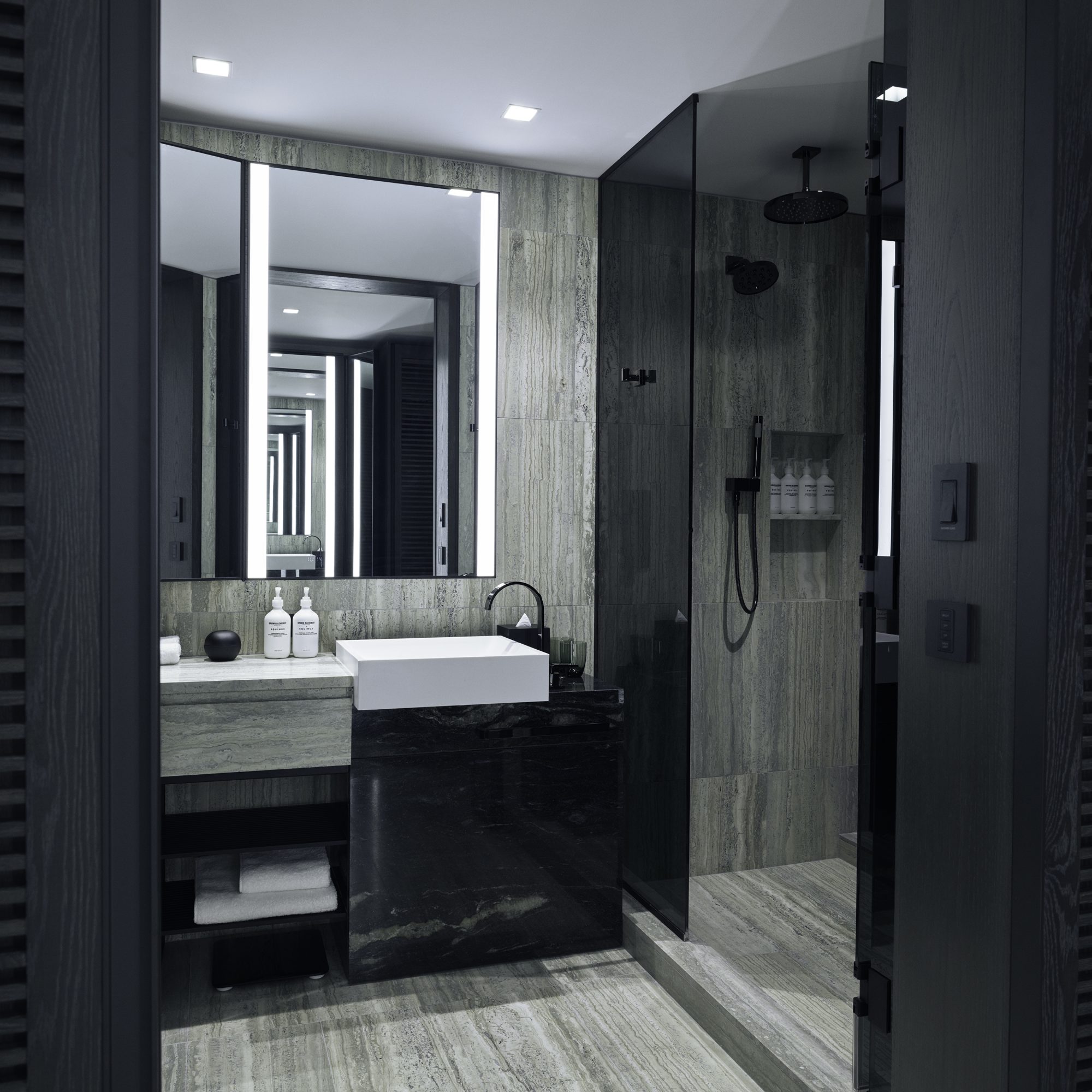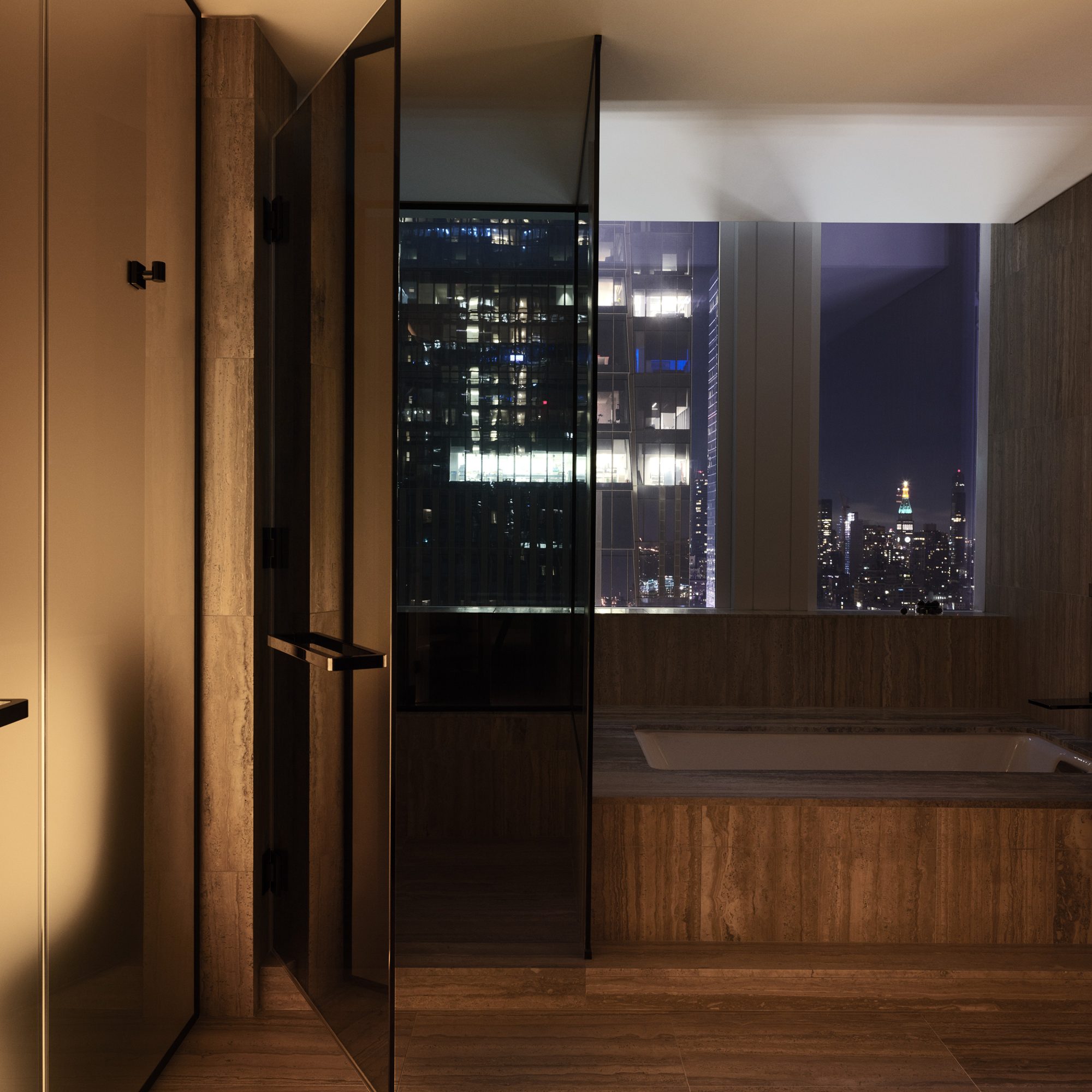 Reawaken or wind down in your spa-grade bathroom, featuring a unique surround shower design that offers three adjustable heads for an immersive, customizable experience. Indulge in our custom Grown Alchemist holistic bath products, made with herbs grown on the High Line park below your room with separate formulas for AM & PM use. Stone-topped vanities, a large closet, and mirrored dressing area provide the space you need to care for yourself, morning and night.
